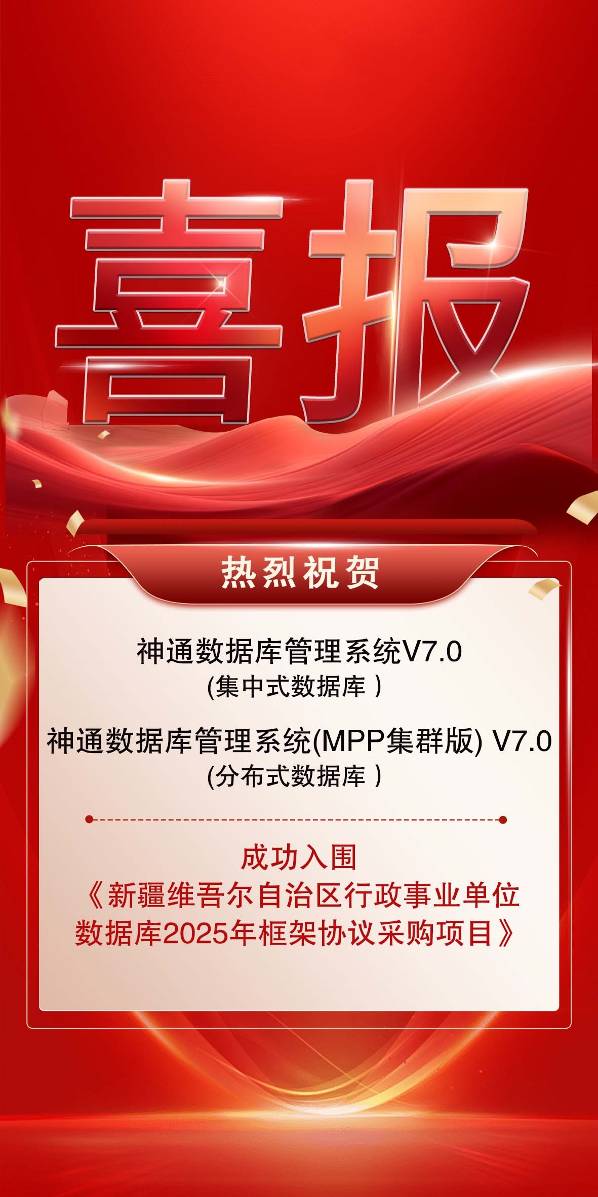 喜訊 神通數(shù)據(jù)庫(kù)集中式和分布式產(chǎn)品入圍新疆維吾爾自治區(qū)行政事業(yè)單位數(shù)據(jù)庫(kù)2025年框架協(xié)議采購(gòu)項(xiàng)目
